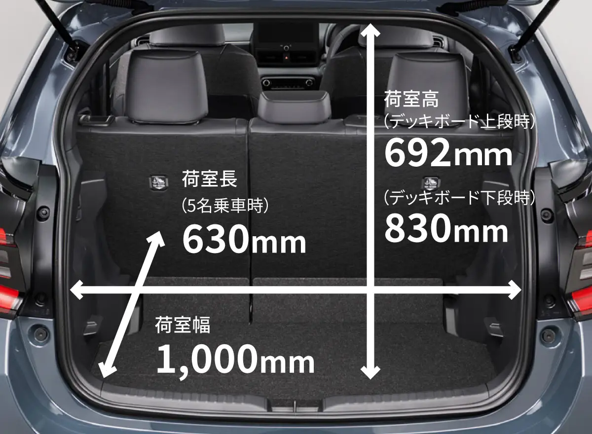 ■数値はトヨタ自動車(株)測定値。測定箇所により数値は異なります。 ■写真はデッキボード下段時。Z(ハイブリッド・2WD)。ボディカラーはマッシブグレー〈1L6〉。内装色はブラック。アクセサリーコンセントはメーカーオプション。 ■写真はイメージです。 標準状態以外のシートアレンジにすると走行できない場合や、ご注意いただきたい項目があります。必ず取扱説明書をご覧ください。 ■積載物のサイズや形状によっては入らない場合や、ご注意いただきたい項目があります。詳しくは販売店にてご確認ください。 ■走行時には、後方視界確保、荷物の転倒防止にご留意ください。