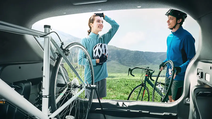 ■写真はZ“Adventure”(ハイブリッド・2WD)。■写真は機能説明のためにボディの一部を切断したカットモデルです。アクセサリーコンセント装着車。 ■デッキボードが下段位置の場合に、9.5インチゴルフバッグを2個積載可能です。なお、ゴルフバッグのサイズや形状によっては収納できない場合があります。詳しくは販売店におたずねください。 ■積載している自転車は27インチサイズ(フロントタイヤ取り外し状態)です。自転車のサイズやシートポジションによっては入らない場合があります。また安全のため荷物は固定してください。 ■標準状態以外のシートアレンジにすると走行できない場合や、ご注意いただきたい項目があります。必ず取扱説明書をご覧ください。 ■積載物のサイズや形状によっては入らない場合や、ご注意いただきたい項目があります。詳しくは販売店にてご確認ください。 ■走行時には、後方視界確保、荷物の転倒防止にご留意ください。