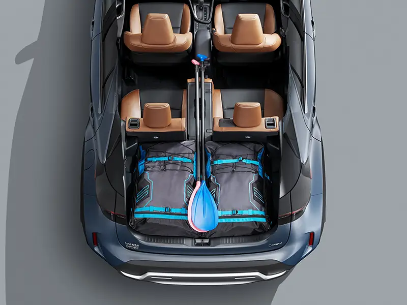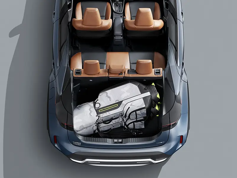 ■写真はZ“Adventure”(ハイブリッド・2WD)。 ■アクセサリーコンセント装着車。 ■数値はトヨタ自動車(株)測定値。測定箇所により数値は異なります。 ■写真はデッキボード上段時。 ■積載物のサイズや形状によっては入らない場合や、ご注意いただきたい項目があります。詳しくは販売店にてご確認ください。 ■走行時には、後方視界確保、荷物の転倒防止にご留意ください。
