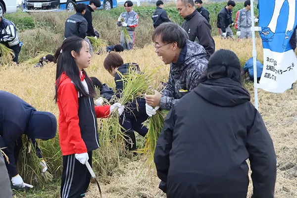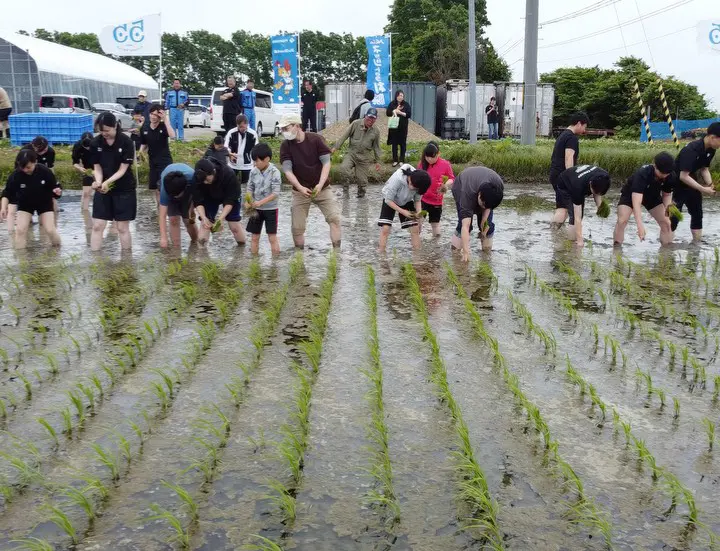 2023年から続いている「米米club」では、毎年恵庭市にある島田農園さんの水田の一角をお借りして田植えと稲刈りをお客様のご家族と一緒にお手伝いしています。田植えの前には、お米ができるまでの工程と食に関するありがたみも教えて頂き、改めてお米の大切さを学びます。刈り取って精米したお米は毎年「子ども食堂」へ寄付しています。