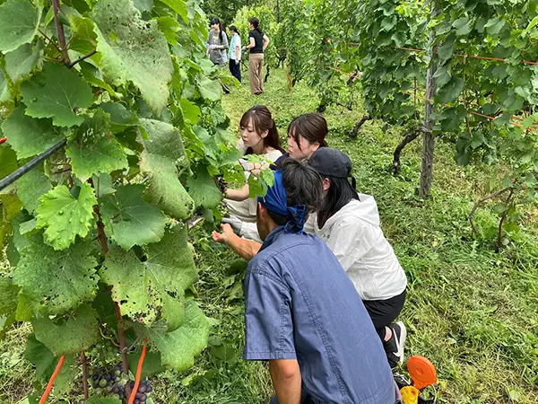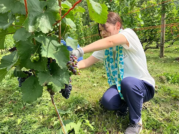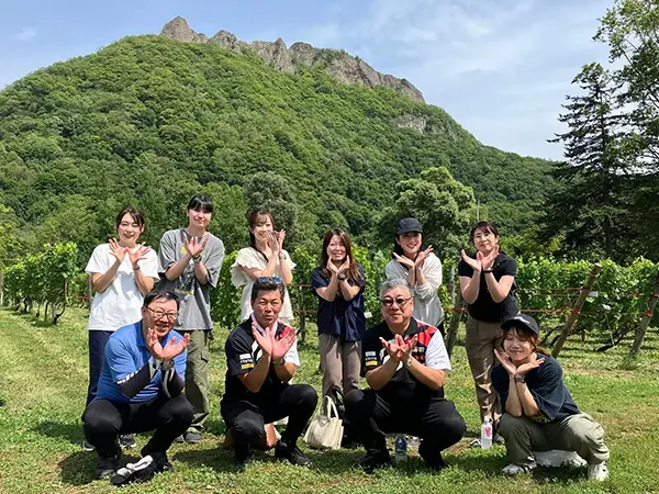 2025年から始まった「ワイナリープロジェクト」では、八剣山ワイナリーさんのぶどう畑でワイン作りのお手伝いをしています。草刈りから始まり、日差しを遮る葉っぱを落としたり、収穫したブドウを足踏みで潰したりと、社員同士協力しながら作業を進めます。2025年収穫分は3年間熟成し、当社創業60周年の記念に全社員へプレゼントする予定です。