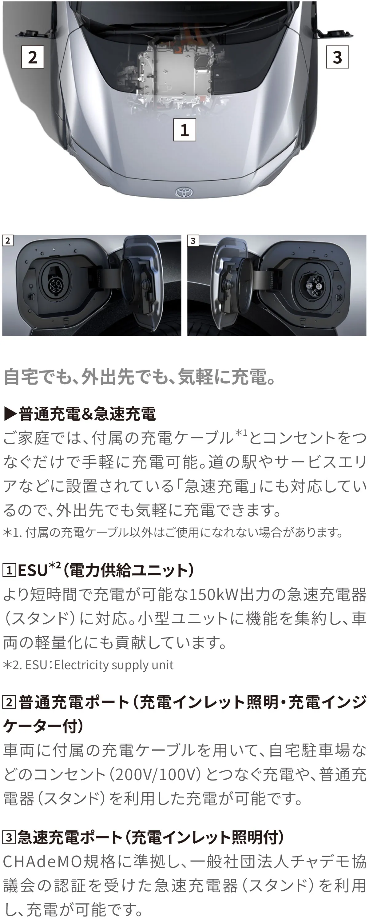 *1.交流電力量消費率および一充電走行距離は定められた試験条件のもとでの値です。お客様の使用環境(気象、渋滞等)や運転方法(急発進、エアコン使用等)に応じて値は大きく異なります。
