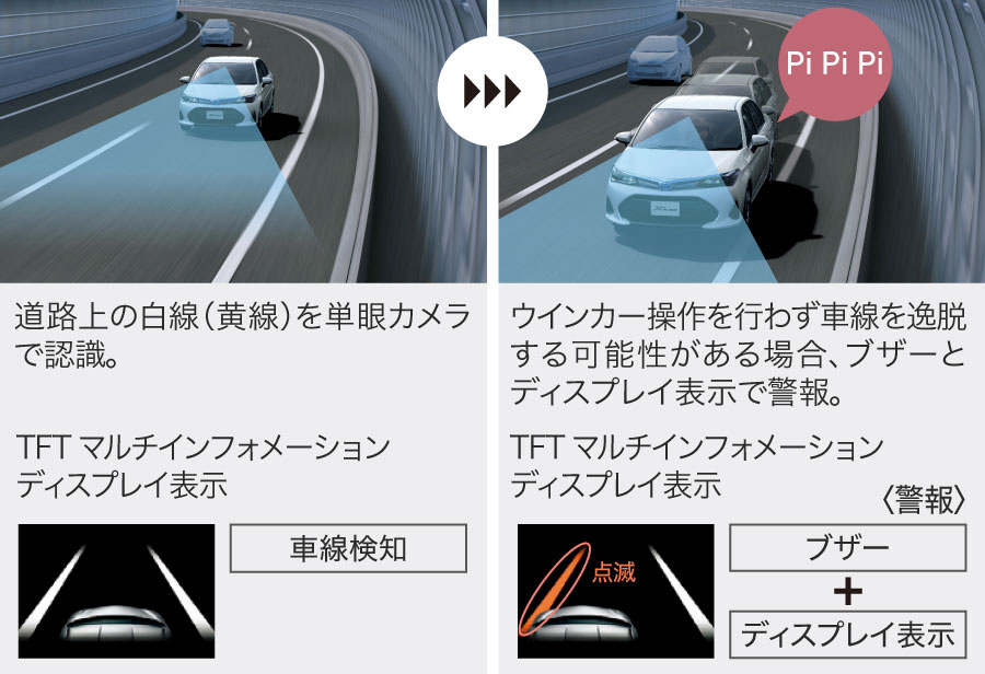 道路上の白線(黄線)を単眼カメラで認識し、ドライバーがウインカー操作を行わずに車線を逸脱する可能性がある場合、ブザーとディスプレイ表示による警報でお知らせします。