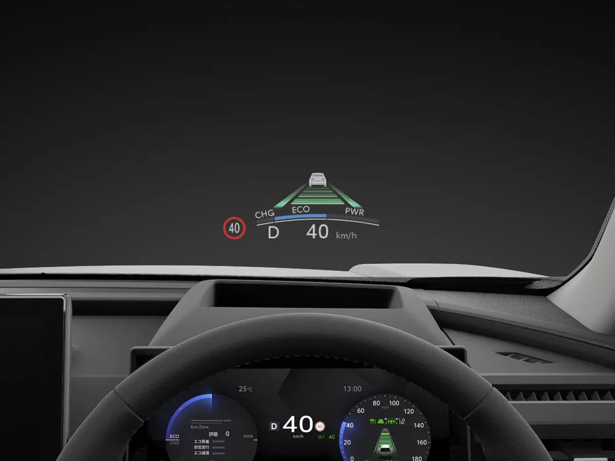 [Zに標準装備] ■表示の明るさは周囲の明るさに応じて自動調節され(任意の操作も可能)、表示位置も任意で調整できます。 ■写真は機能説明のために各ランプを点灯したものです。実際の走行状態を示すものではありません。 ■画面はハメ込み合成です。