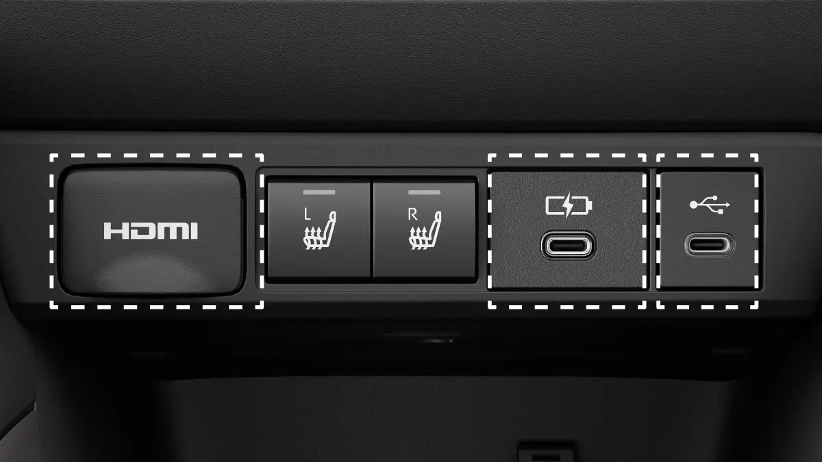 〈左〉HDMI入力端子 〈中央〉充電用USB端子(Type-C) 〈右〉USB入力(動画・音楽再生/給電[Type-C])