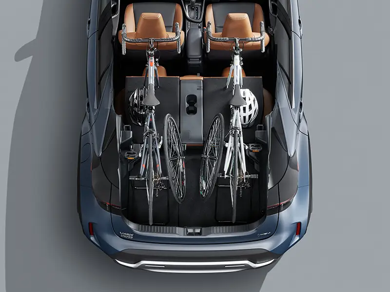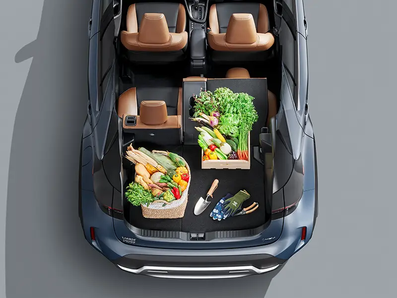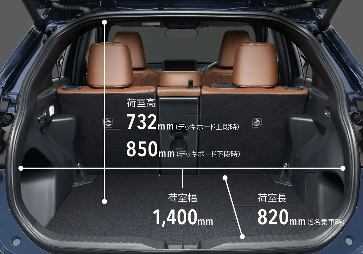 ■写真はZ“Adventure”(ハイブリッド・2WD)。 ■アクセサリーコンセント装着車。 ■数値はトヨタ自動車(株)測定値。測定箇所により数値は異なります。 ■写真はデッキボード上段時。 ■積載物のサイズや形状によっては入らない場合や、ご注意いただきたい項目があります。詳しくは販売店にてご確認ください。 ■走行時には、後方視界確保、荷物の転倒防止にご留意ください。