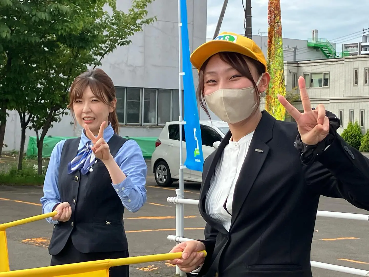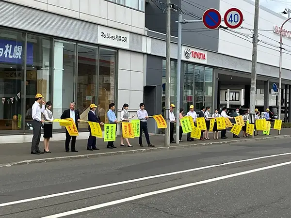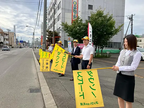 毎年4月から9月までの月1回、「人の波運動」を実施しています。これは、朝の通勤等で混雑する道路沿いに手旗を持って交通安全の注意喚起を行う全国交通安全運動の取り組みで、当社も全店舗で行っています。手旗にはそれぞれ「シートベルト着用」や「飲酒運転絶対ダメ!」といったメッセージが書かれていて、通行している車のドライバーへ交通安全を促します。また、手旗の波の効果でスピードダウンにも繋がります。