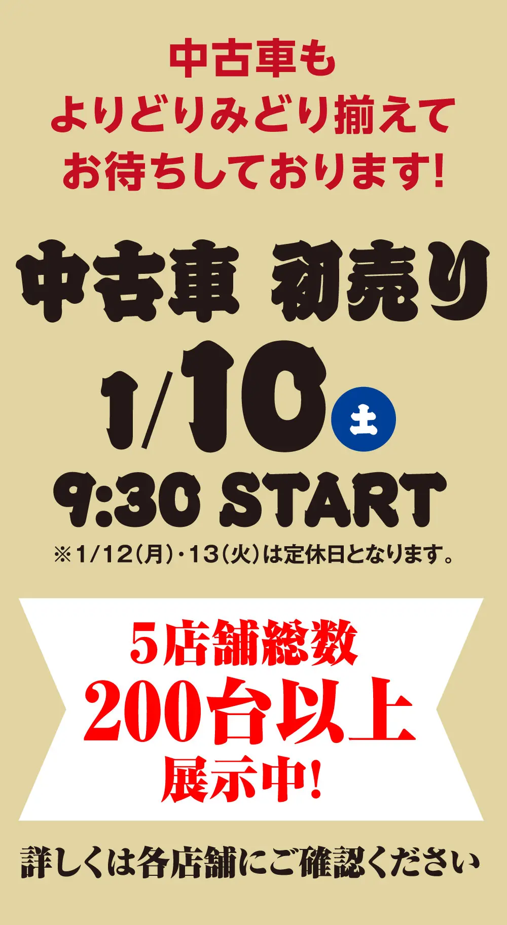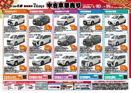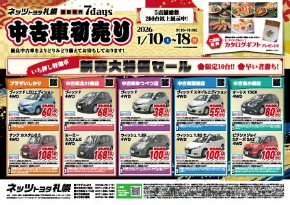 1月10日(土)・11日(日)・14日(水)・15日(木)・16日(金)・17日(土)・18日(日)の7日間、ネッツトヨタ札幌の全店で『新春初売7days』を開催いたします。 期間中は、豪華ご成約特典やご来店アンケート特典、メンテナンスサービスの限定特典などをご用意して皆様をお待ちしております。 中古車7daysのチラシもご覧ください おもて面[PDF:4.6MB] うら面[PDF:2.0MB] お得な新春初売7日間!!この機会をぜひお見逃しなく!お近くのネッツトヨタ札幌でお待ちしております! 店舗情報はこちら